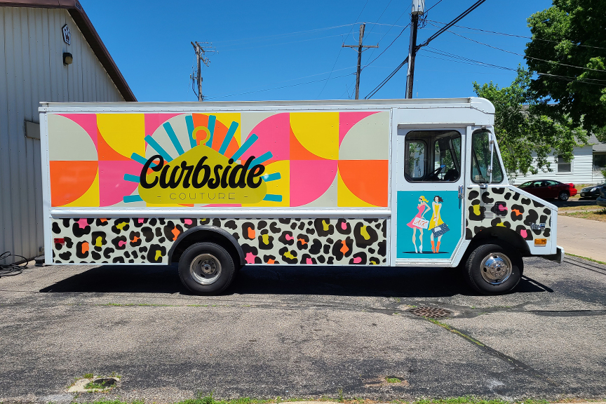 Curbside Couture’s first mobile boutique had to catch people’s attention and communicate what they do. The graphics we worked up with them turned out amazing!